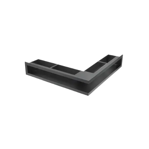 Graças ao seu design assimétrico, adapta-se perfeitamente a instalações em canto, permitindo uma distribuição eficiente do ar quente em locais onde grelhas tradicionais não seriam adequadas. O acabamento em aço pintado preto confere-lhe durabilidade, resistência ao calor e um visual elegante e discreto.